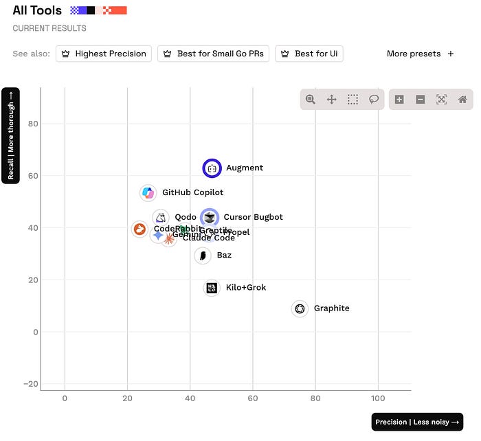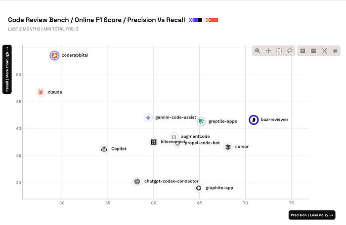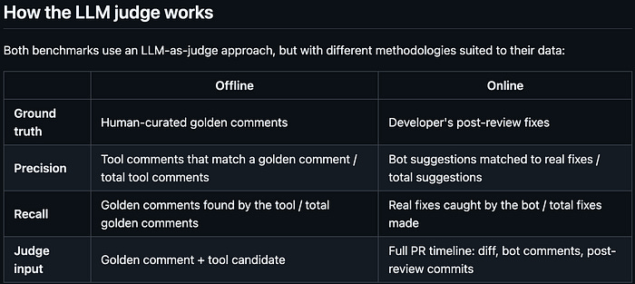 Each PR has curated golden comments with severity labels. An LLM judge matches each tool’s review against the golden comments and computes precision and recall.The Online Benchmark (The Continuous Reality Check): This is where the benchmark gets revolutionary. It continuously samples fresh real-world PRs from GitHub where code review bots left comments. Because the PRs are recent, tools can’t have memorized them during training.